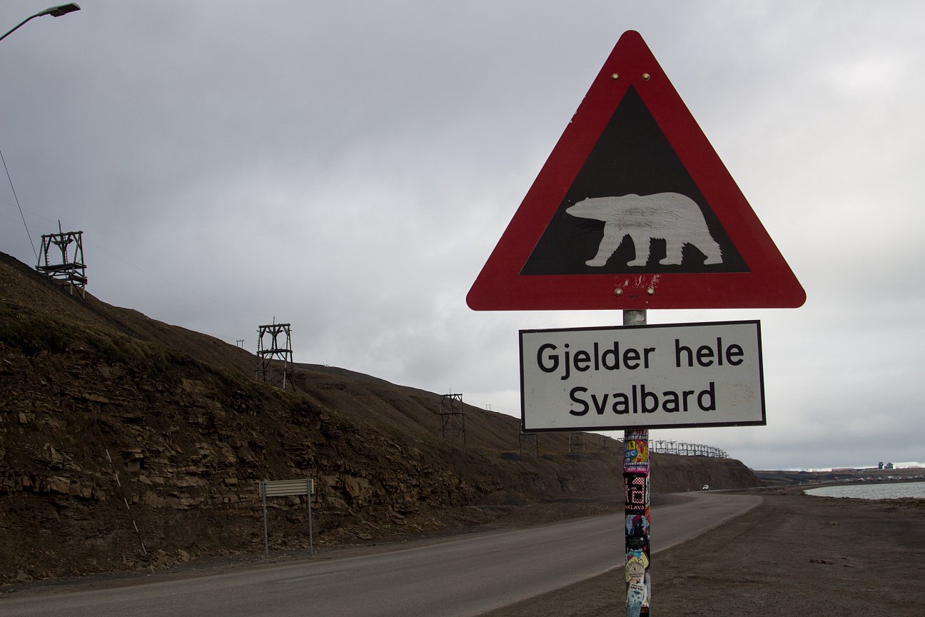 Ostrzeżenie przed niedźwiedziami polarnymi. W obrębie miasteczka oficjalnie nie ma zagrożenia, ale 2-kilometrowy odcinek z lotniska w teorii jest już poza bezpieczną strefą. Jednak dość duży ruch pojazdów na tej drodze powoduje że szanse spotkania miśka są znikome.